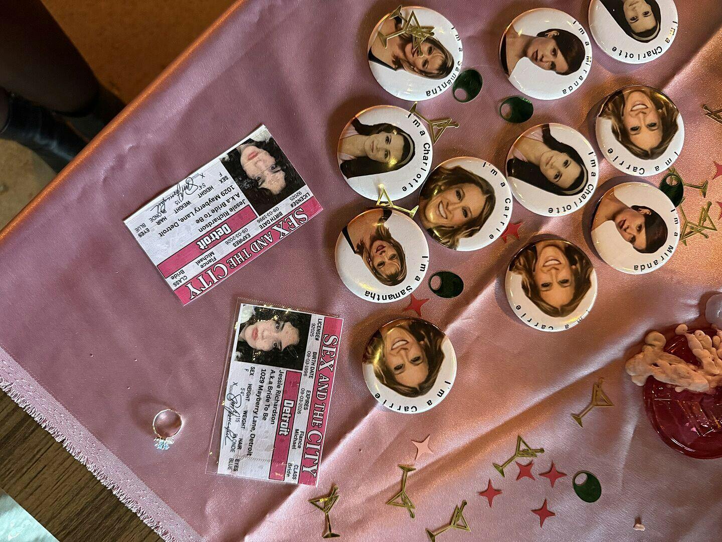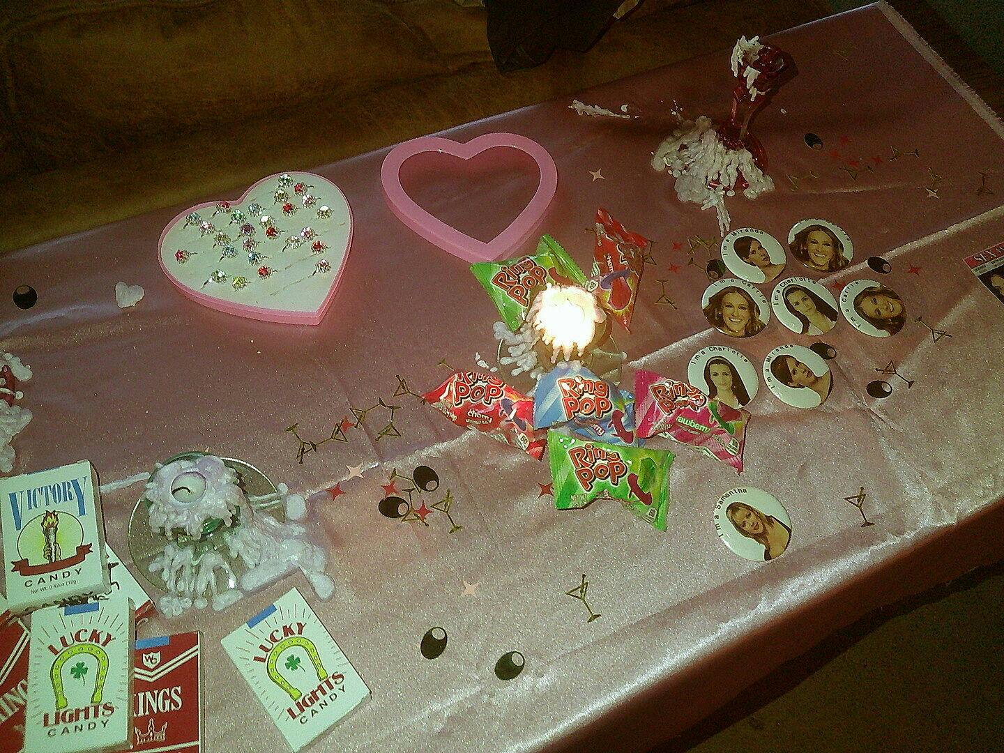 Gold martini glasses, green olives + pink and red sparkles